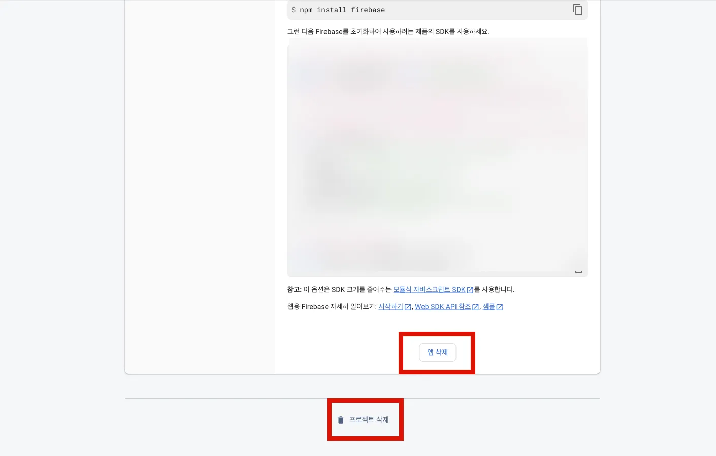 가장 하단부분에는 **\[앱 삭제]** 와 **\[프로젝트 삭제]** 가 있는데요!\